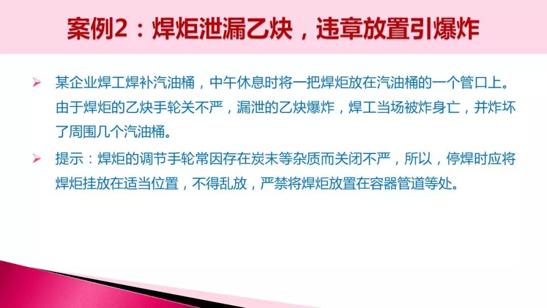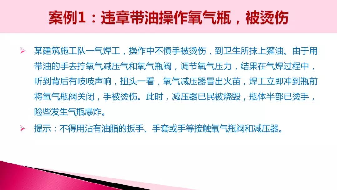(3)水暖乙不懂氣焊安全操作知識(shí),開(kāi)啟閥門過(guò)猛,且又站在氧氣出口方向,屬于違章作業(yè),釀成事故。