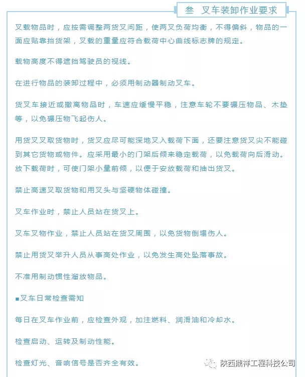 叉車是一種工業(yè)搬運車輛,是指對成件托盤貨物進(jìn)行裝卸、堆垛和短距離運輸作業(yè)的各種輪式搬運車輛,駕駛叉車的人員必須經(jīng)過專業(yè)正規(guī)的培訓(xùn),通過市場監(jiān)督部門的考核,取得特種操作證,并經(jīng)公司同意后方能駕駛,嚴(yán)禁無證操作。鼎祥安全始終銘記所有生產(chǎn)安全都與安全生產(chǎn)培訓(xùn)息息相關(guān),叉車事故層出不窮,其正確操作是所有叉車操作人員及其安全管理員需知道的,一起來學(xué)習(xí)吧!