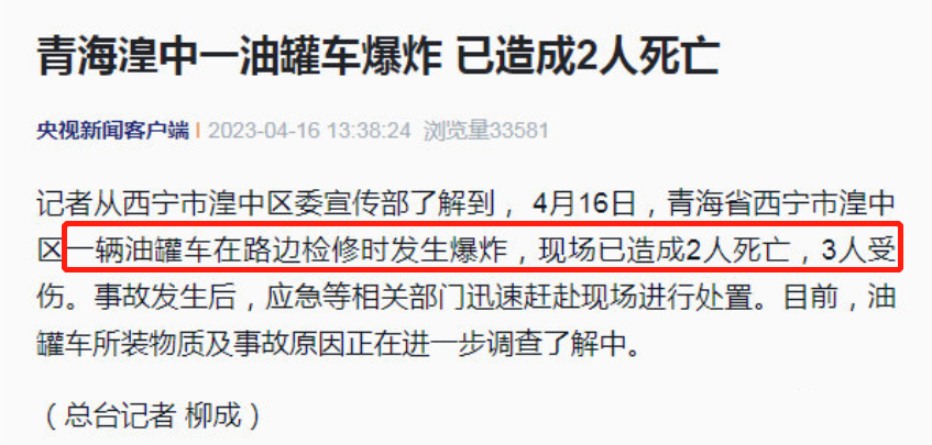4月16日,青海省西寧市湟中區(qū)一輛油罐車在路邊檢修時(shí)發(fā)生爆炸,現(xiàn)場已造成2人死亡,3人受傷。