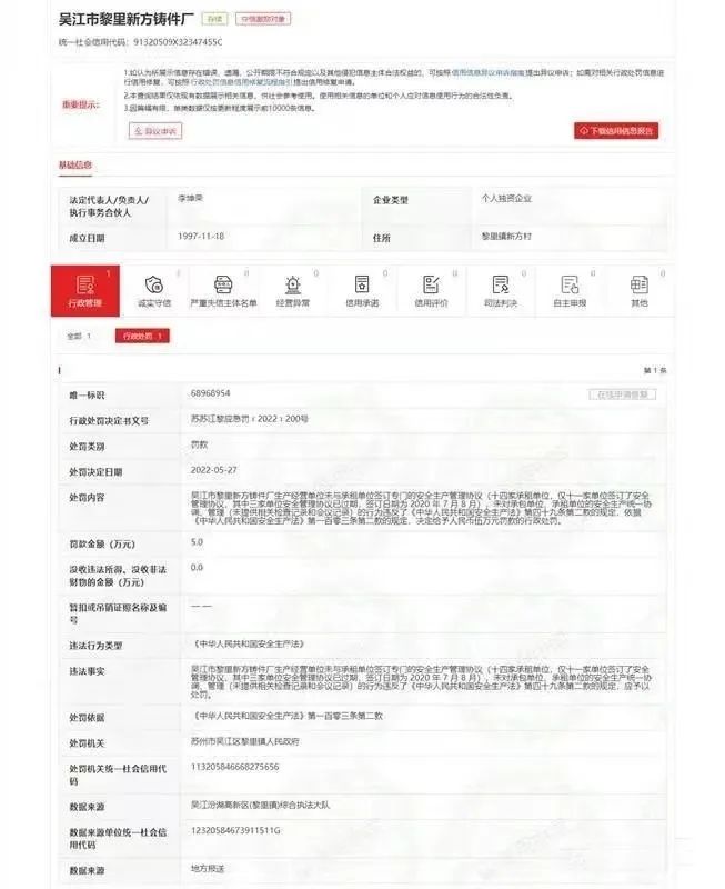 最新案例:2022年5月27日,蘇州市吳江區(qū)黎里鎮(zhèn)人民政府作出蘇蘇江黎應(yīng)急罰﹝2022﹞200號處罰決定書,吳江市黎里新方鑄件廠違反了《中華人民共和國安全生產(chǎn)法》第四十九條第二款的規(guī)定,依據(jù)《中華人民共和國安全生產(chǎn)法》第一百零三條第二款,給予吳江市黎里新方鑄件廠罰款人民幣5.0萬元的行政處罰。