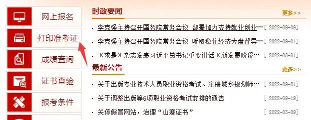 1、打開中國人事考試網(wǎng),點擊左側(cè)的“打印準考證”。